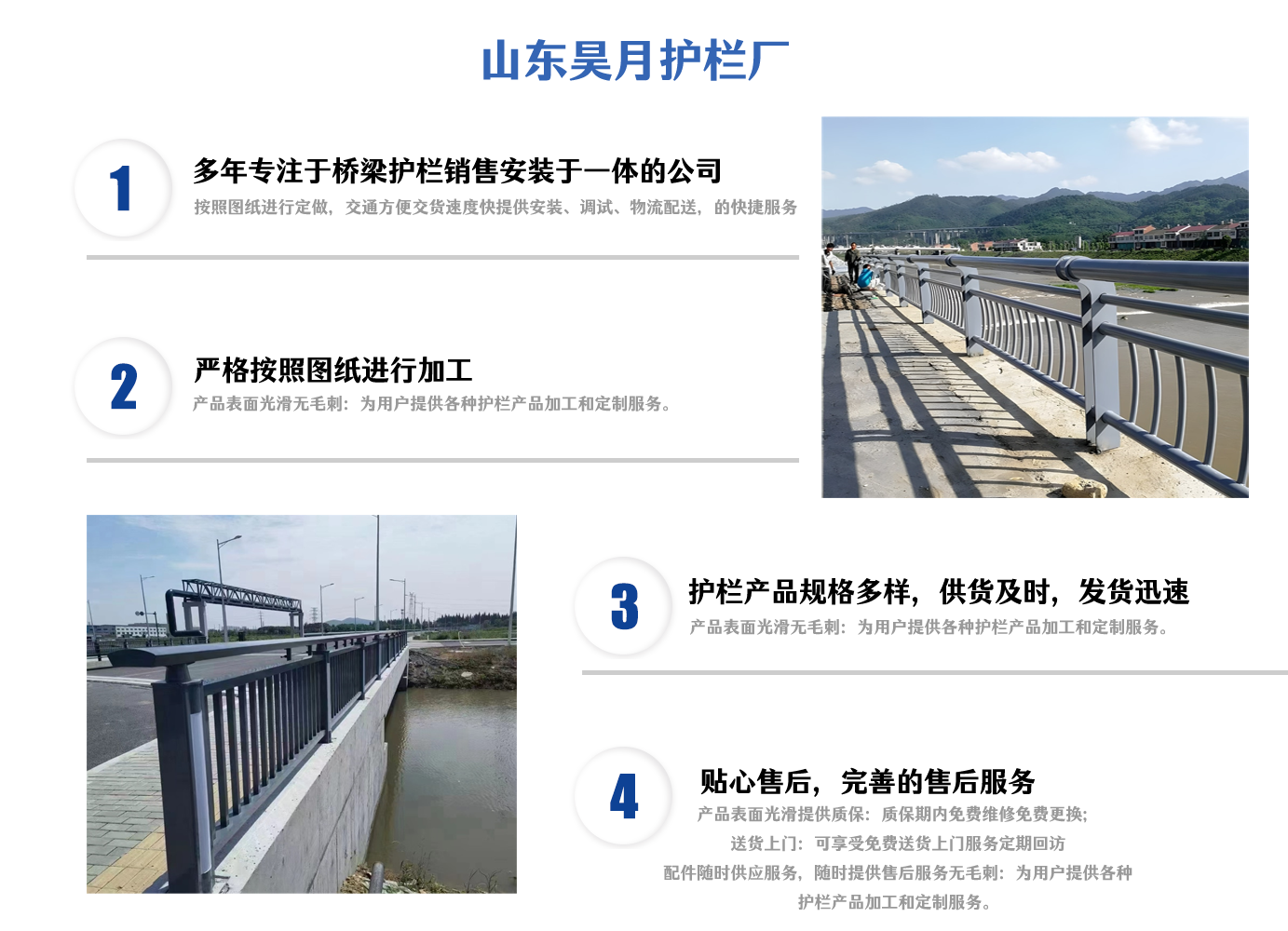 山東昊月金屬制品有限公司坐落于原材料豐富人文和諧交通發(fā)達(dá)及有“江北水城”之稱——聊城。 公司以科技興廠為宗旨,積極引進(jìn)人才和技術(shù),不斷開拓創(chuàng)新. 主營產(chǎn)品:SS級橋梁防撞護(hù)欄,不銹鋼復(fù)合管護(hù)欄,鋁合金護(hù)欄,燈光護(hù)欄,河道護(hù)欄等等。產(chǎn)品本公司建立了一套科學(xué)的行之有效的質(zhì)量體系,擁有一支高技術(shù)、高素質(zhì)團(tuán)隊,堅持以“誠信”為本,堅持“優(yōu)質(zhì)的質(zhì)量、貼心的服務(wù)”為崇高理念,為用戶提供質(zhì)優(yōu)價廉的產(chǎn)品提供至真至誠的服務(wù)。與客戶合作雙贏、攜手共創(chuàng)輝煌?! 」疽钥茖W(xué)的工藝、嚴(yán)格的質(zhì)量管理、完善的服務(wù)理念、合理的銷售價格贏得了良好的聲譽(yù),建立了密切和愉快的合作關(guān)系。多年來,我們一直以良好的品質(zhì)、合理的價格,完善的質(zhì)量保障體系,完善的售后服務(wù)為客戶提供周到的服務(wù),滿足廣大客戶的需求。 我們以信譽(yù)求生存,以質(zhì)量去競爭,以真誠換合作,以效益求發(fā)展,是我們的服務(wù)宗旨。我們積極主動與同行加強(qiáng)交流與時俱進(jìn),邁向新的歷程!我們竭誠歡迎您的咨詢和洽談,愿與同行業(yè)的同胞們合作共贏。...